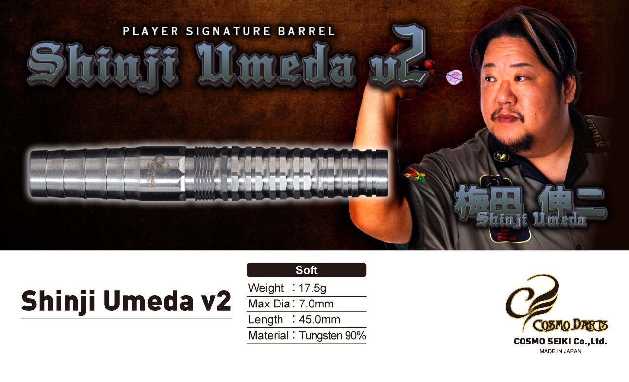 COSMO DARTSの「Shinji Umeda v2」は、梅田伸二選手が考案したダーツバレルです。実戦での使用を前提に設計されており、スペックとしては**全長45.0mm、最外径7.0mm、重量17.5g、素材はタングステン90%**となっています。