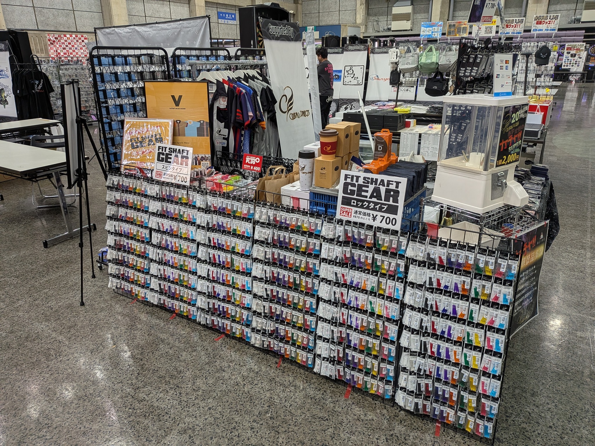 会場内はすでに多くの出店者や運営スタッフが入り、ダーツマシンの搬入やステージ設営など、明日の本番に向けた準備が進んでいました😅